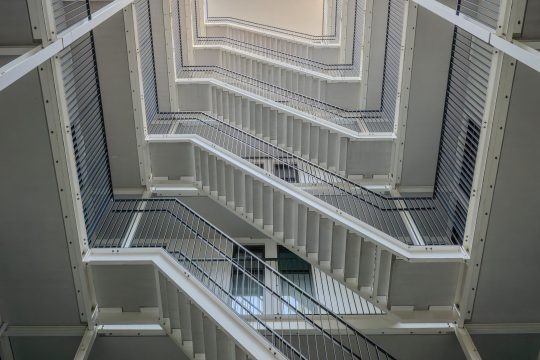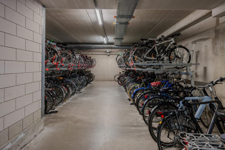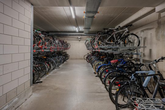 Central entrance, with mailboxes and intercom system. Adjacent to this is the central hall with the staircase, elevators and access to the communal bicycle storage area and rear parking garage. The parking garage contains your own storage room and private parking space.