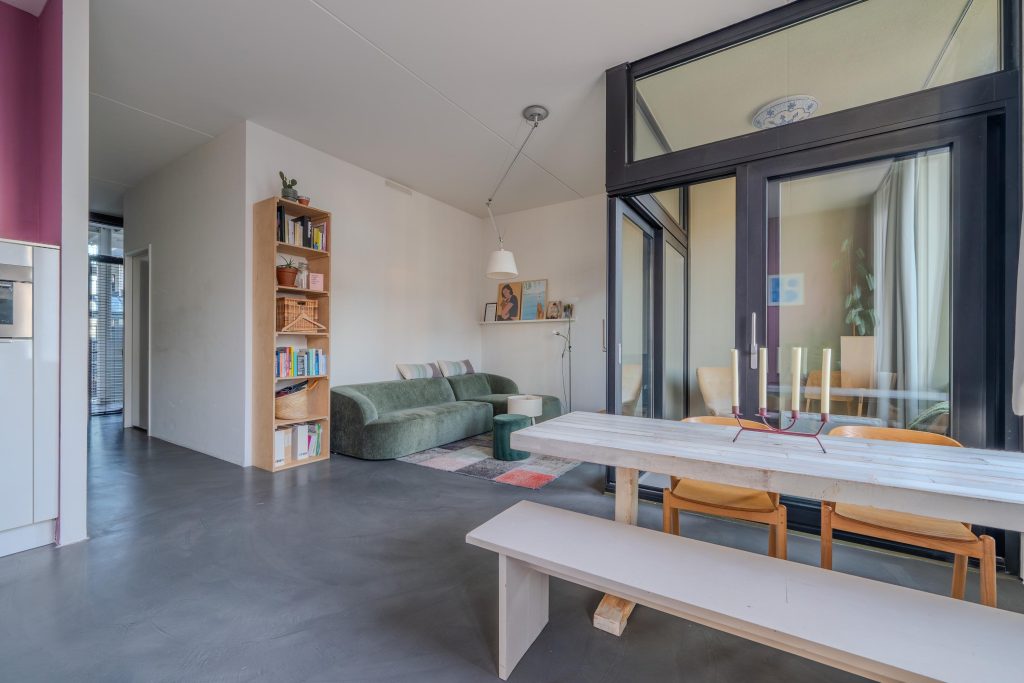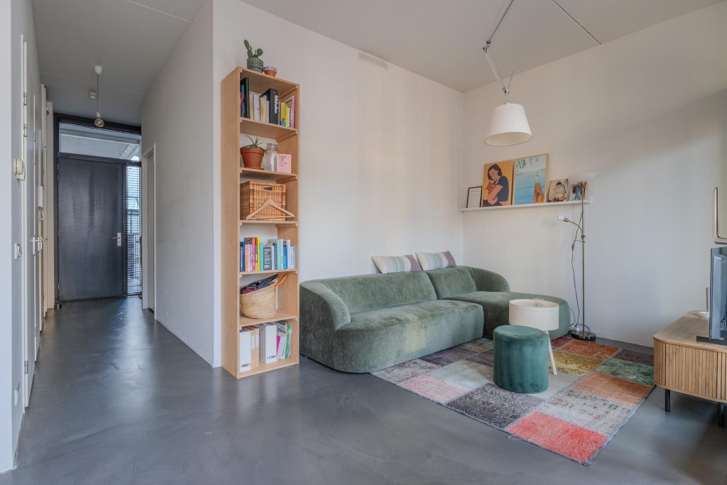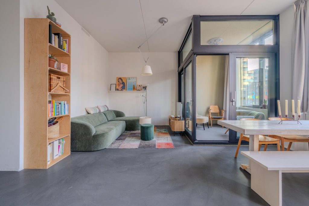 De woonkamer is ruim en licht middels de grote raampartijen, voorzien van schuurwerk wanden en wit gesausd betonnen plafond. Grenzend aan de woonkamer bevindt zich het inpandig balkon (loggia) met Frans balkon welke te bereiken is middels twee schuifpuien en voorzien van screens evenals de woonkamer.
