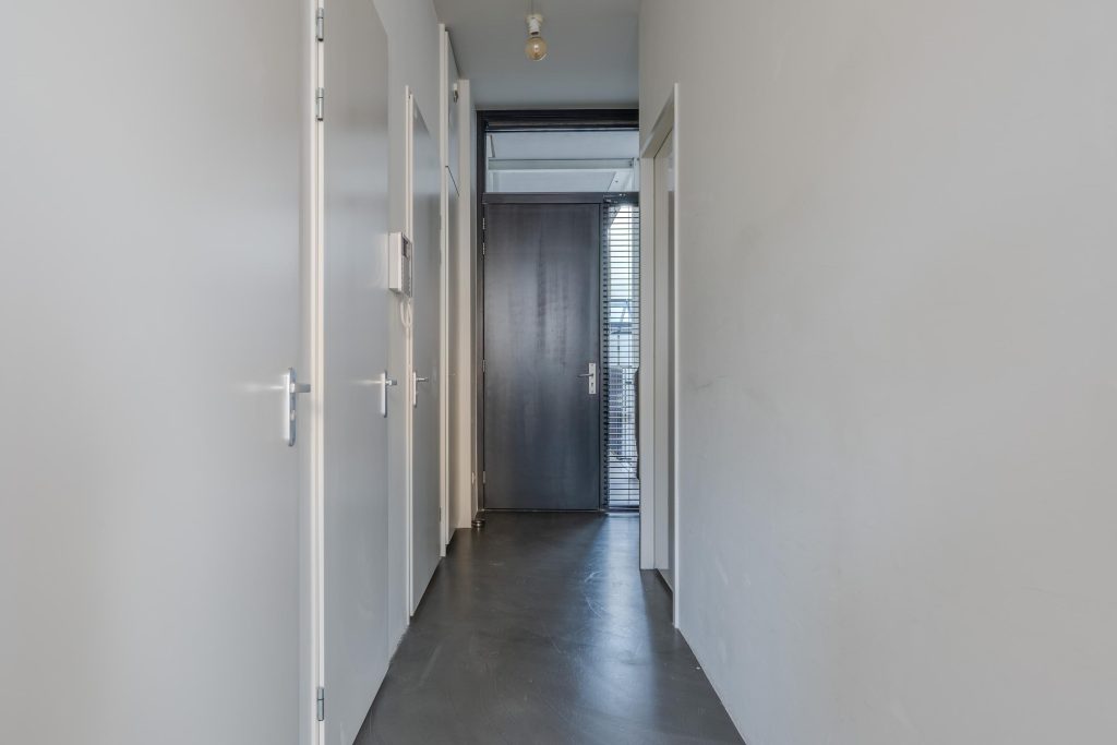 Entree appartement, het hele appartement is afgewerkt met een gietvloer met vloerverwarming. Vanuit de hal toegang tot de meterkast, de slaapkamer, badkamer, inpandige berging en het toilet. Aan het einde van de hal komt men in het woongedeelte met de open keuken.