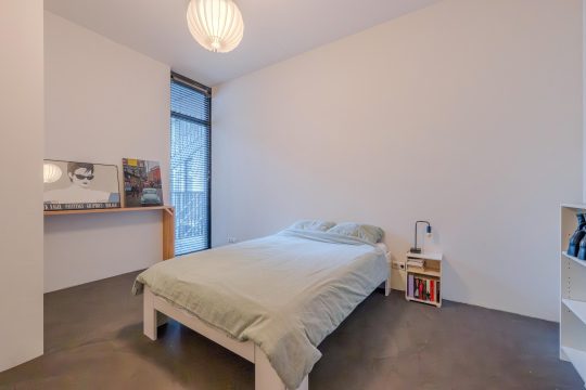 Bedroom, with cast floor with underfloor heating and white painted concrete ceiling.