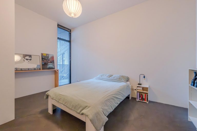 Slaapkamer, met gietvloer met vloerverwarming en wit gesausd betonnen plafond.