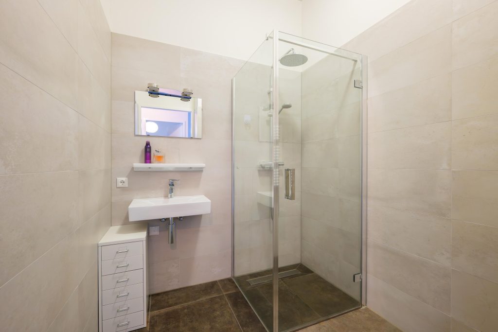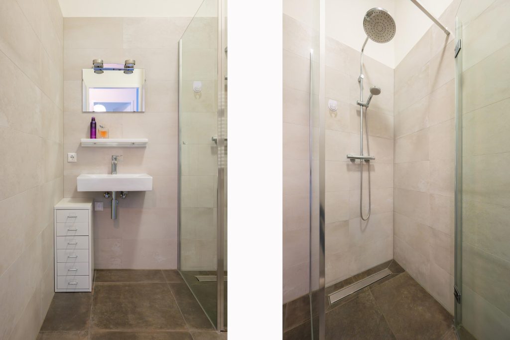 Bathroom, fully tiled and equipped with a walk-in shower with hand and rain shower and thermostatic tap, a washbasin with single-lever mixer tap and mechanical ventilation.