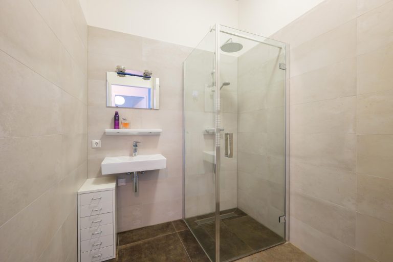 Badkamer, geheel betegeld en voorzien van een inloopdouche met hand- en regendouche en thermostaatkraan, een wastafel met ééngreeps mengkraan en een mechanische ventilatie.