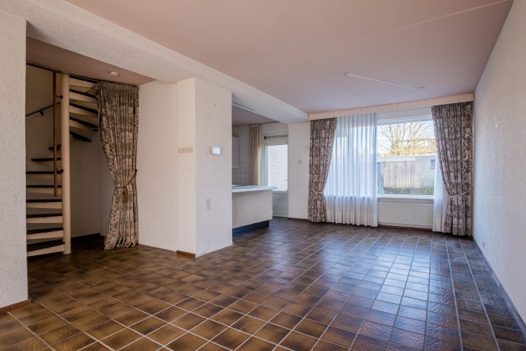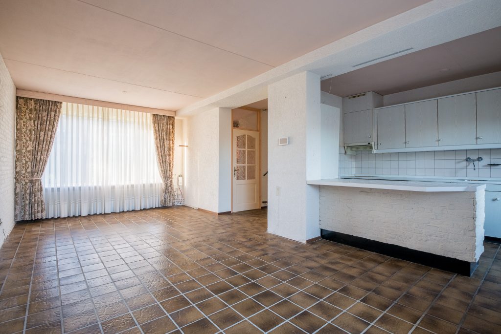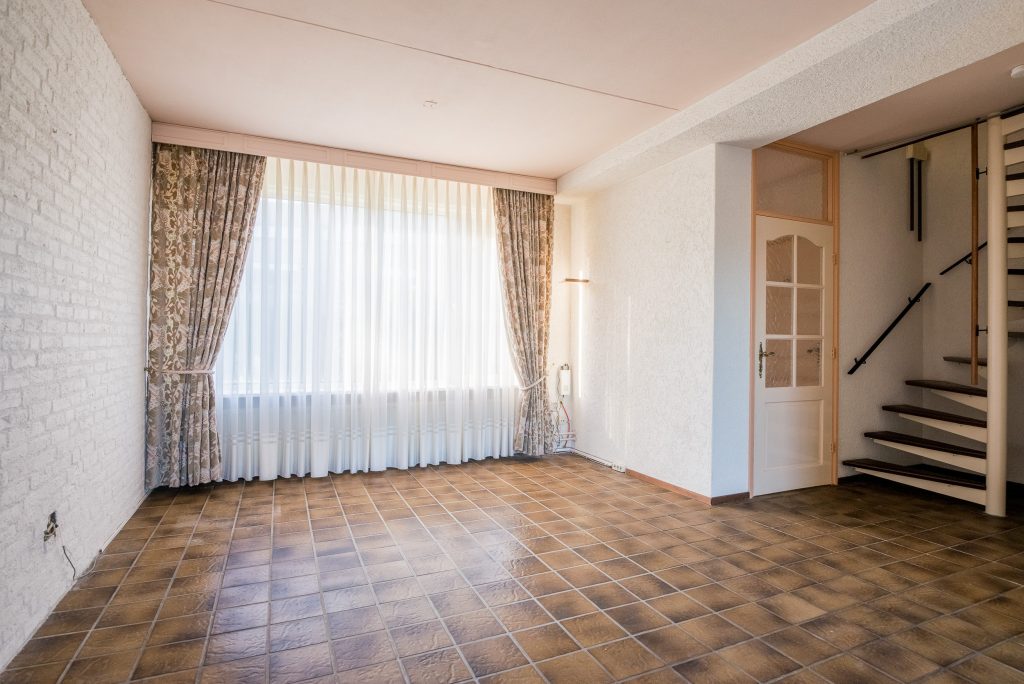 T-vormige woonkamer, met tegelvloer, granol en wit gesausde schoonmetselwerk wanden en spuitwerk plafond. Door de grote raampartijen geniet de woonkamer veel natuurlijke lichtinval. De trap naar de eerste verdieping bevindt zich in de woonkamer.