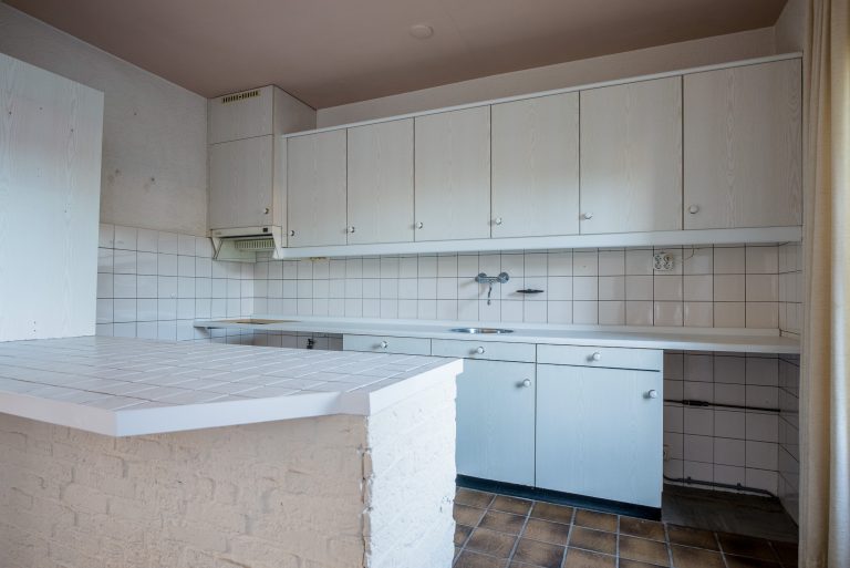 Open keuken, met tegelvloer, deels betegelde wanden en spuitwerk plafond. Voorzien van een eenvoudige witte kunststof keukeninrichting in houtmotief met een wit kunststof aanrechtblad en een rvs spoelbak. De keuken is geplaatst in een rechte opstelling en voorzien van een afzuigkap. Vanuit de keuken heeft men middels een deur toegang tot de tuin.