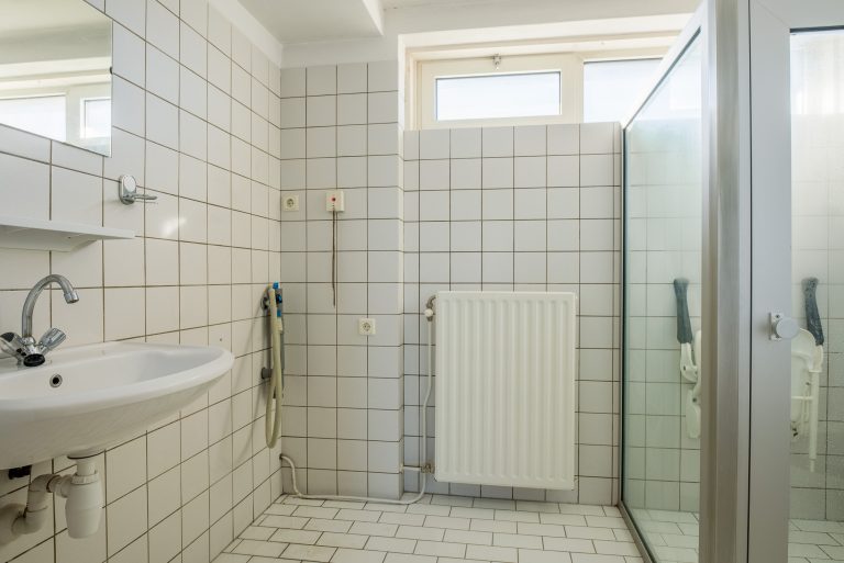Badkamer, geheel betegeld en met spuitwerk plafond. Voorzien van een vaste wastafel, een douche met cabine, een closet met laaghangend reservoir en de aansluiting voor de wasmachine.