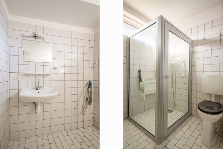 Toilet, deels betegeld, voorzien van een closet met laaghangend reservoir.