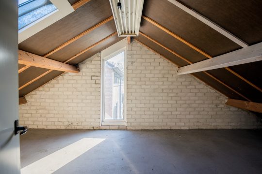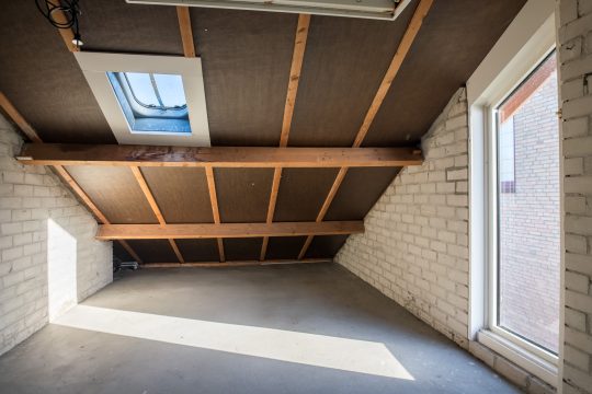 Slaapkamer 4, met betonvloer, metselwerk wanden en dakplaten plafond.