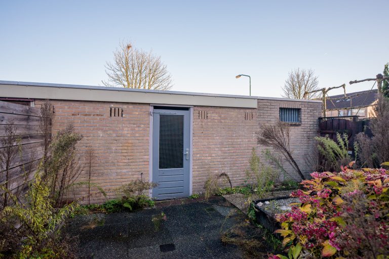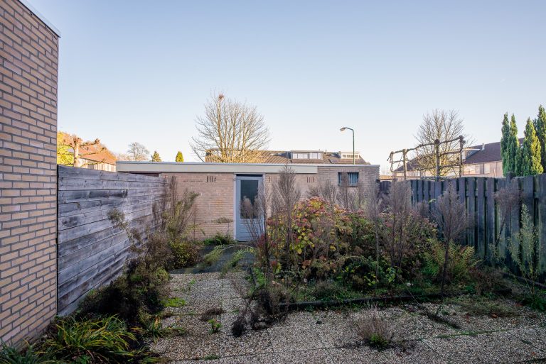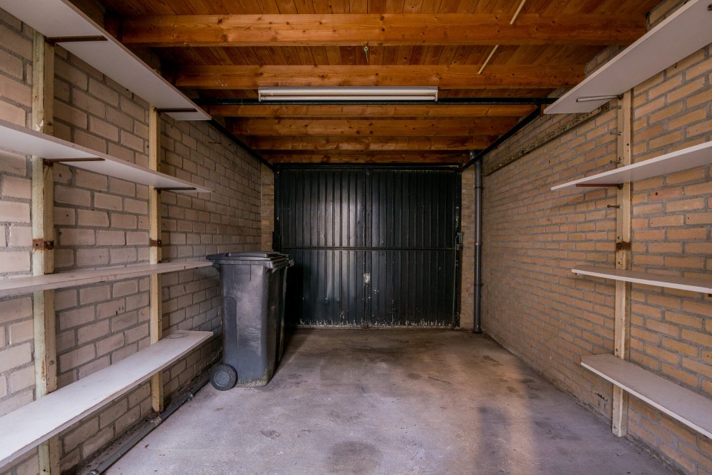 Aangelegde achtertuin, met terras, houten schuttingen en houten poort naar het zijpad. Achterin de tuin staat de garage, met betonvloer, metselwerk wanden en houten platen plafond en voorzien van elektra.