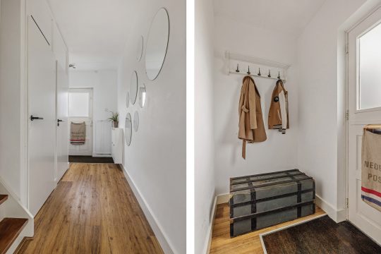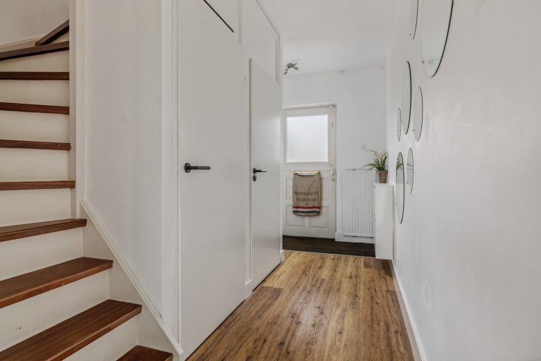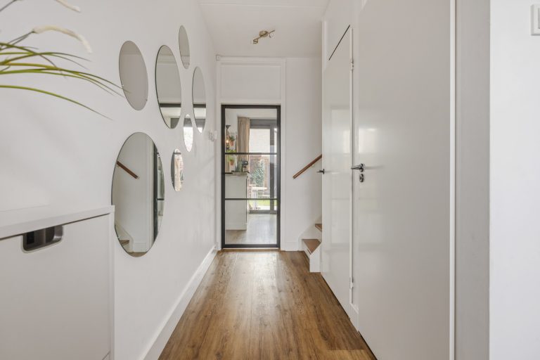 Hal, met pvc vloer, schuurwerk wanden en spuitwerk plafond. In de hal bevindt zich een garderoberuimte, het toilet en onder de trap een kelderkast. In de kelderkast is de meterkast geplaatst die voorzien is van 9 lichtgroepen, 1 krachtgroep, 3 aardlekschakelaars en de PV groep.