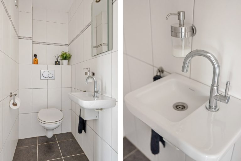 Vernieuwd toilet, geheel betegeld en met schuurwerk plafond met inbouwspots. Voorzien van een wandcloset en een fonteintje.