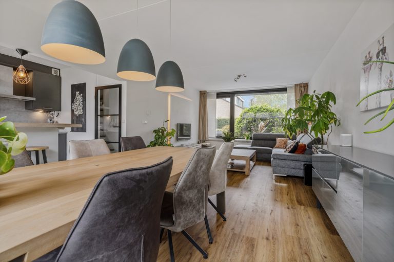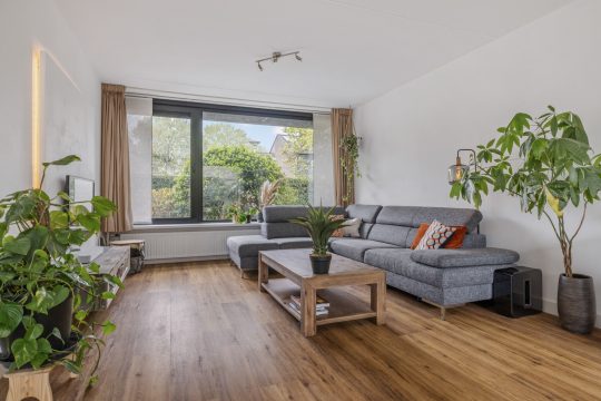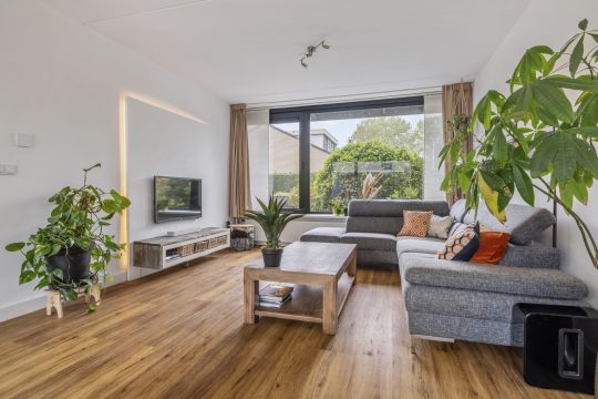 Ruime lichte doorzonwoonkamer, met pvc vloer, schuurwerk wanden en spuitwerk plafond. Middels een schuifpui heeft men toegang tot de achtertuin.