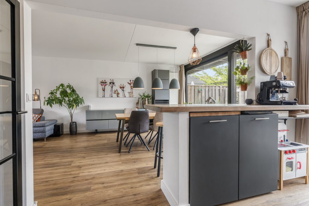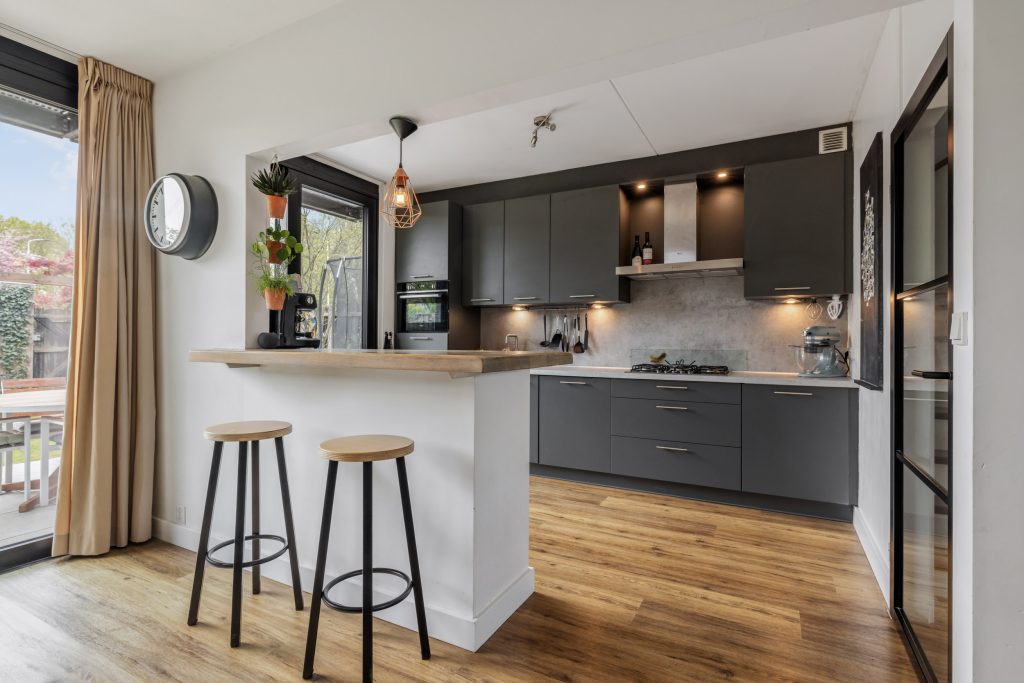 Open keuken met eetbar, met pvc vloer, schuurwerk wanden en spuitwerk plafond, voorzien van een antraciet kunststof keukeninrichting met kunststof aanrechtblad en rvs spoelbak. De keuken is voorzien van een koelkast, een 5-pits gaskookplaat, een rvs schouwafzuigkap, combi-oven, vaatwasser en Quooker. Vanuit de keuken heeft men middels een schuifpui toegang tot de achtertuin.
