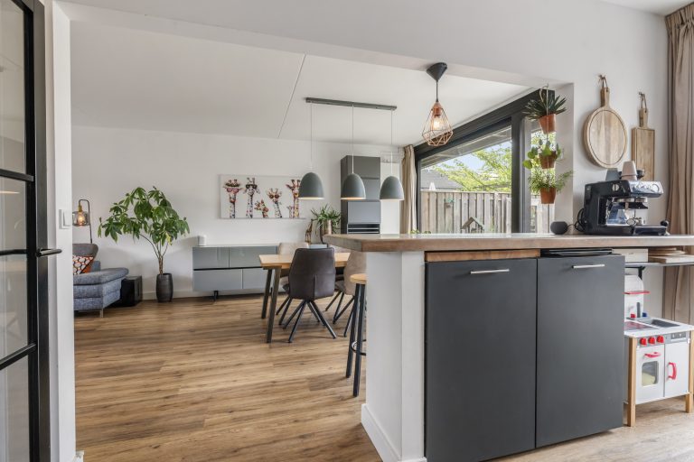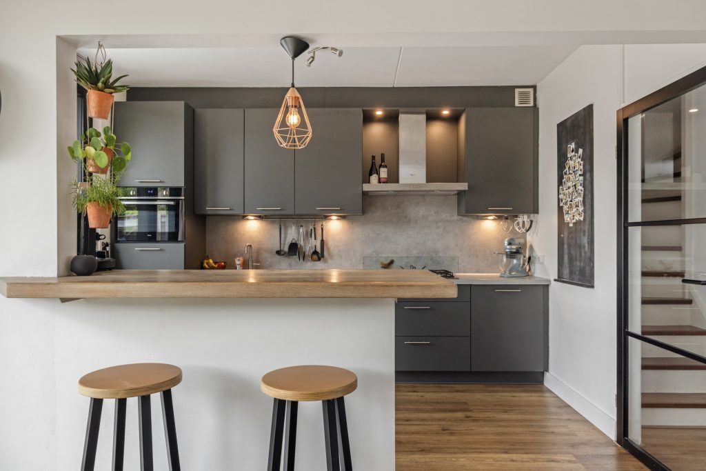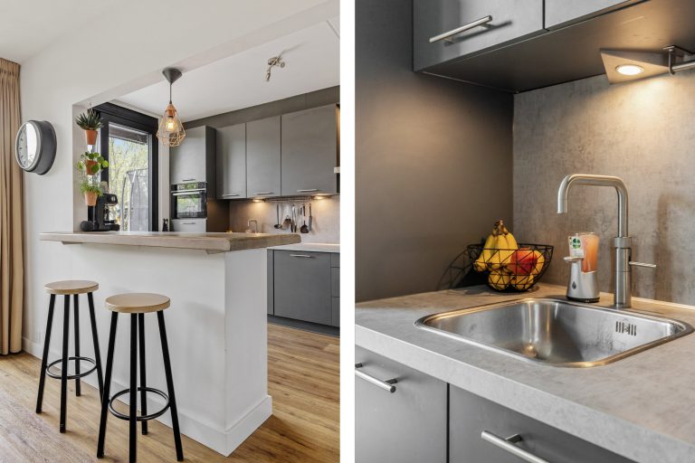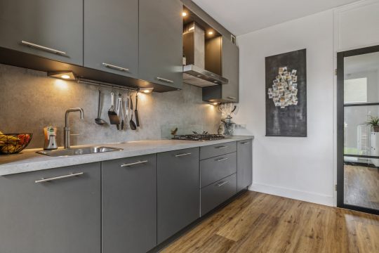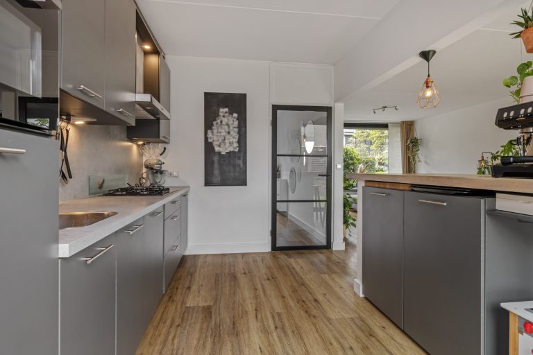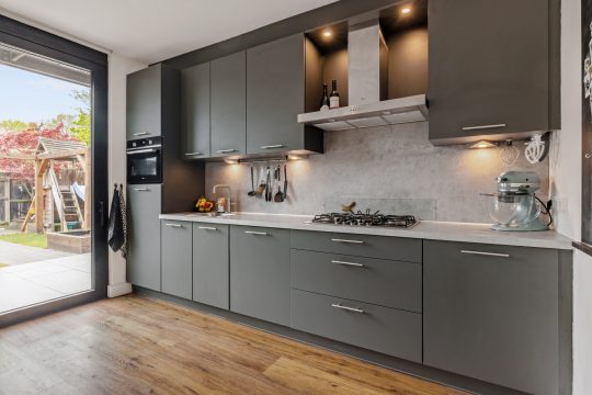 Open kitchen with a food counter, with PVC flooring, sanded walls and spray-painted ceiling, featuring anthracite kitchen cabinets with countertop and stainless steel sink. The kitchen is equipped with a refrigerator, a 5-burner gas stove, a stainless steel range hood, a combination oven, a dishwasher and a Quooker. From the kitchen, through a sliding glass door provide access to the backyard.