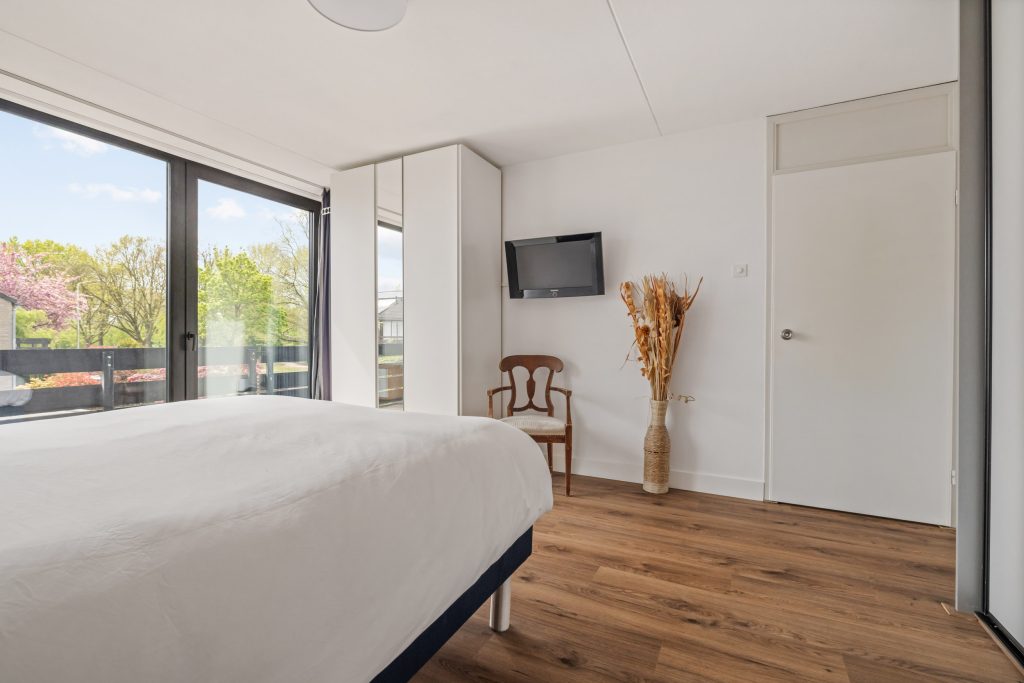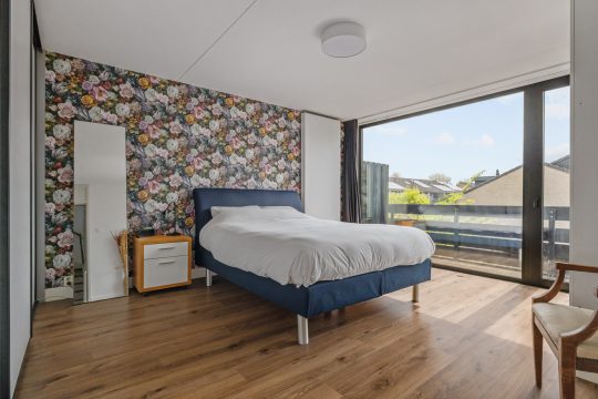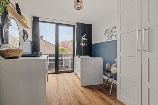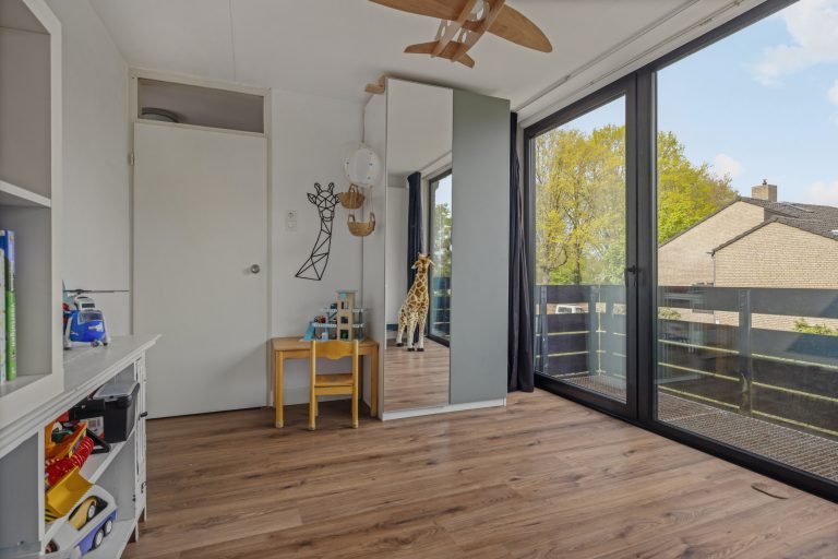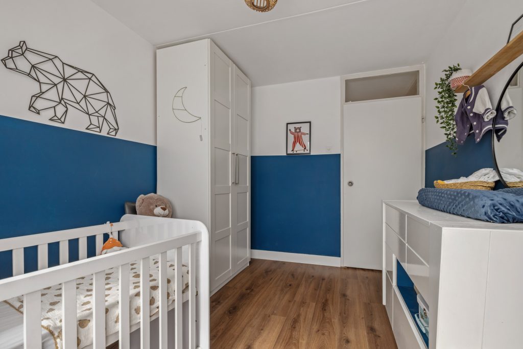 Slaapkamer 2, gelegen aan de achterzijde, met laminaatvloer, behangen en schuurwerk wanden en spuitwerk plafond. Deze slaapkamer is voorzien van een 3-deurs kastenwand. Met deur die toegang geeft tot het balkon aan de achterzijde.