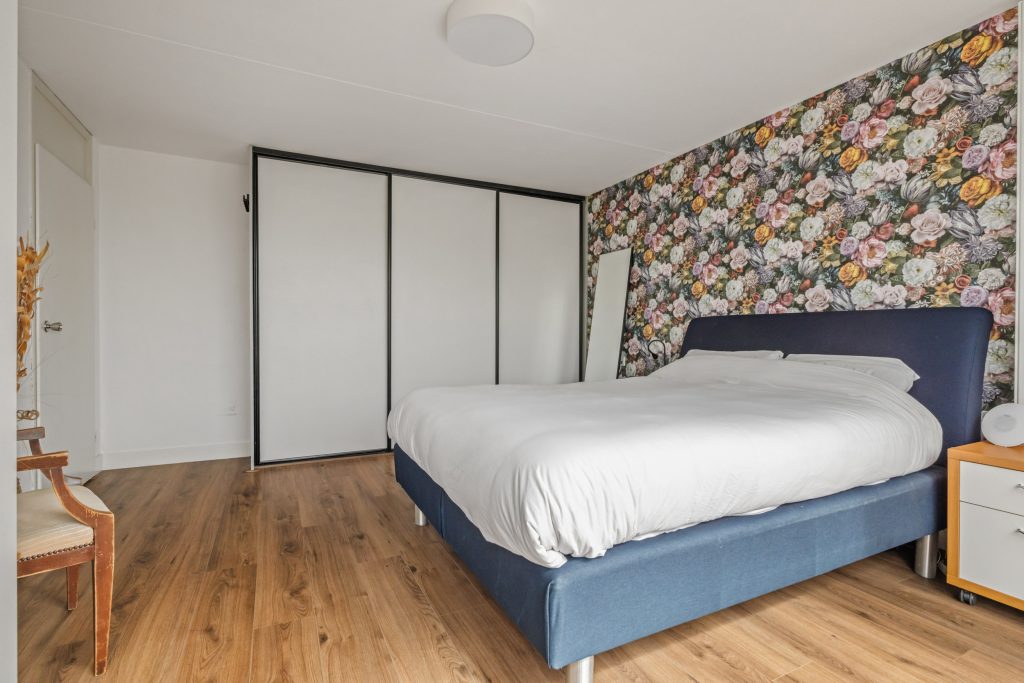 Slaapkamer 1, gelegen aan de voorzijde, met laminaatvloer, schuurwerk wanden en spuitwerk plafond. Middels een deur heeft men toegang tot het balkon aan de voorzijde.