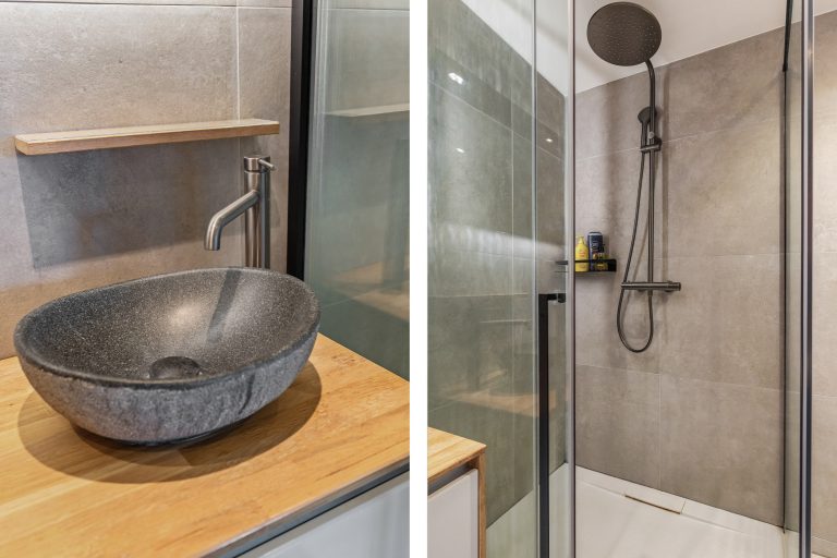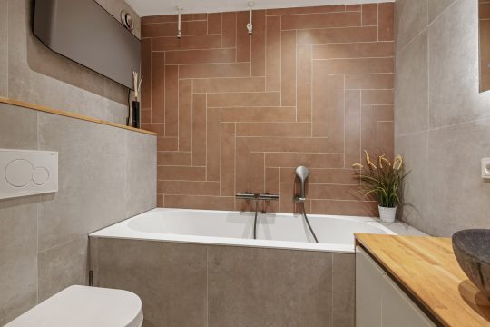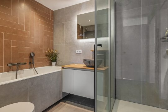 Badkamer, geheel betegeld en met schuurwerk plafond met inbouwspots, voorzien van een wastafelmeubel, een inloopdouche met regen- en handdouche en thermostaatkraan, een ligbad met thermostaatkraan, een designradiator, toilet en mechanische ventilatie.