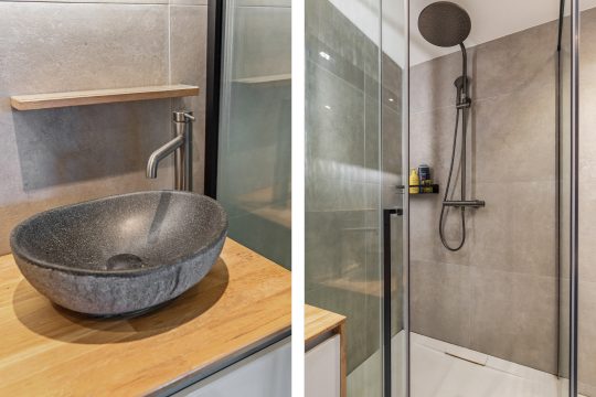 Bathroom, fully tiled with a sanded ceiling featuring recessed spotlights, equipped with a vanity unit, a walk-in shower with rain and hand showerheads and a thermostatic faucet, a bathtub with a thermostatic faucet, a designer radiator, a toilet and mechanical ventilation.
