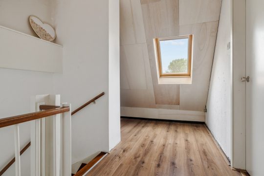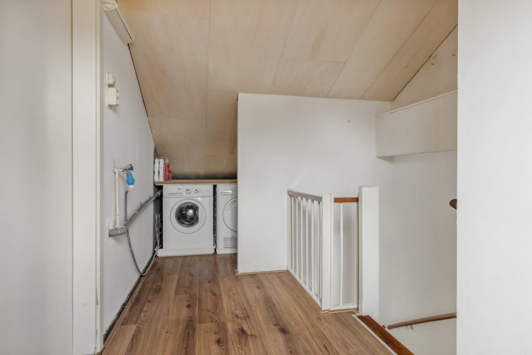Overloop, bereikbaar middels open trap, met laminaatvloer, schuurwerk wanden en met flexiplex platen plafond. Hier bevinden zich de opstelling van de c.v. combiketel (Remeha Avanta/2017), de unit van de mechanische ventilatie en de aansluiting voor de wasappatuur.