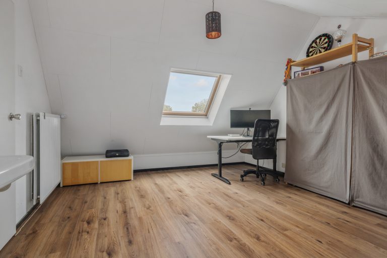 Slaapkamer 3, gelegen aan de achterzijde, met laminaatvloer, schuurwerk wanden en spuitwerk plafond.