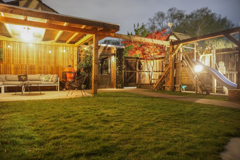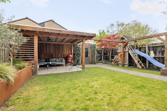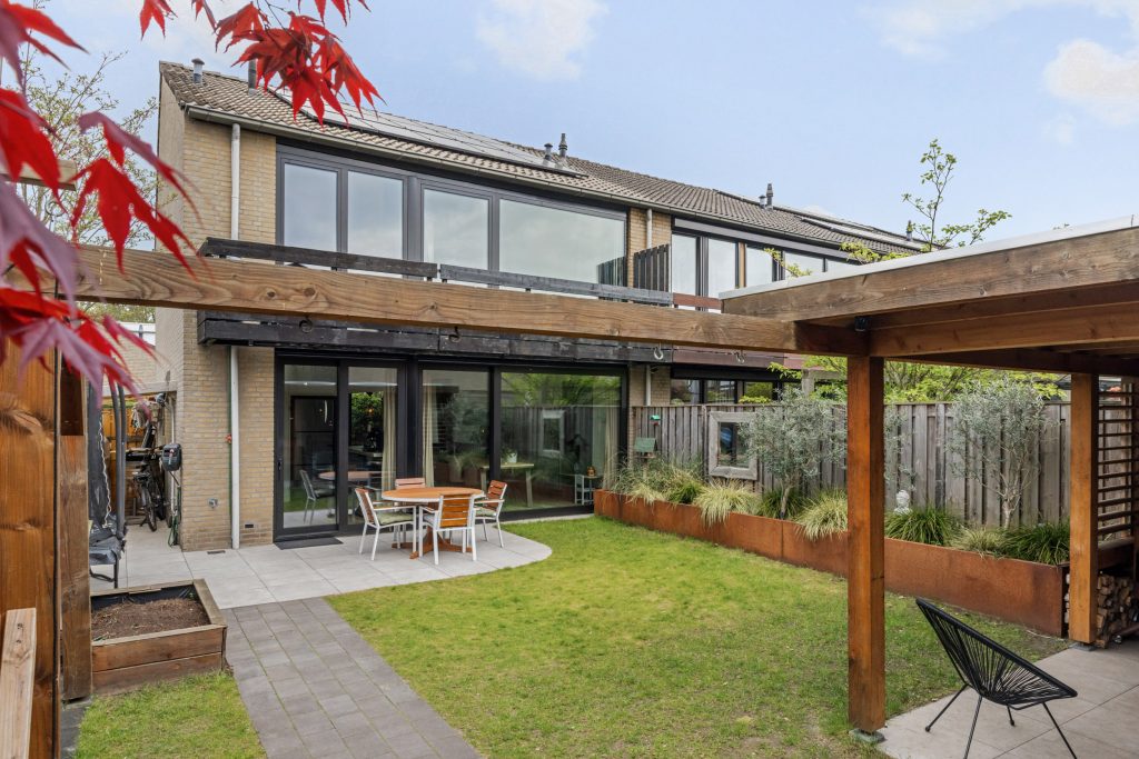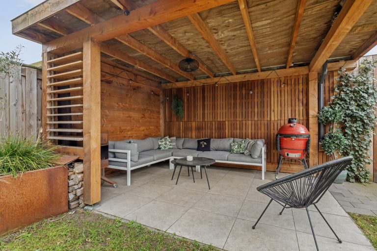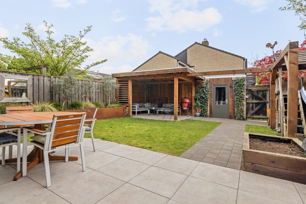 Aangelegde voor- en zijtuin met overkapping en dubbele poort naar de achtertuin.