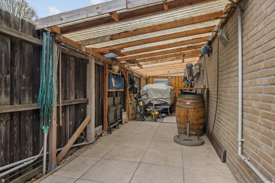 Garage, aan de garage is een terrasoverkapping geplaatst welke is voorzien van elektra. De garage heeft een betonvloer, metselwerk wanden en een dakplaten plafond, voorzien van elektra.