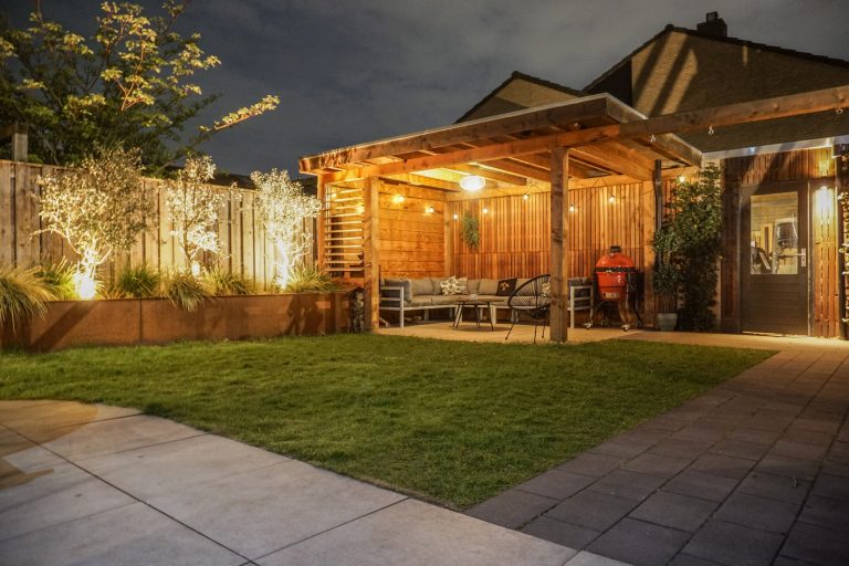 Landscaped backyard, featuring a patio, lawn and various Corten steel planters that also house the sprinklers for the lawn irrigation system.