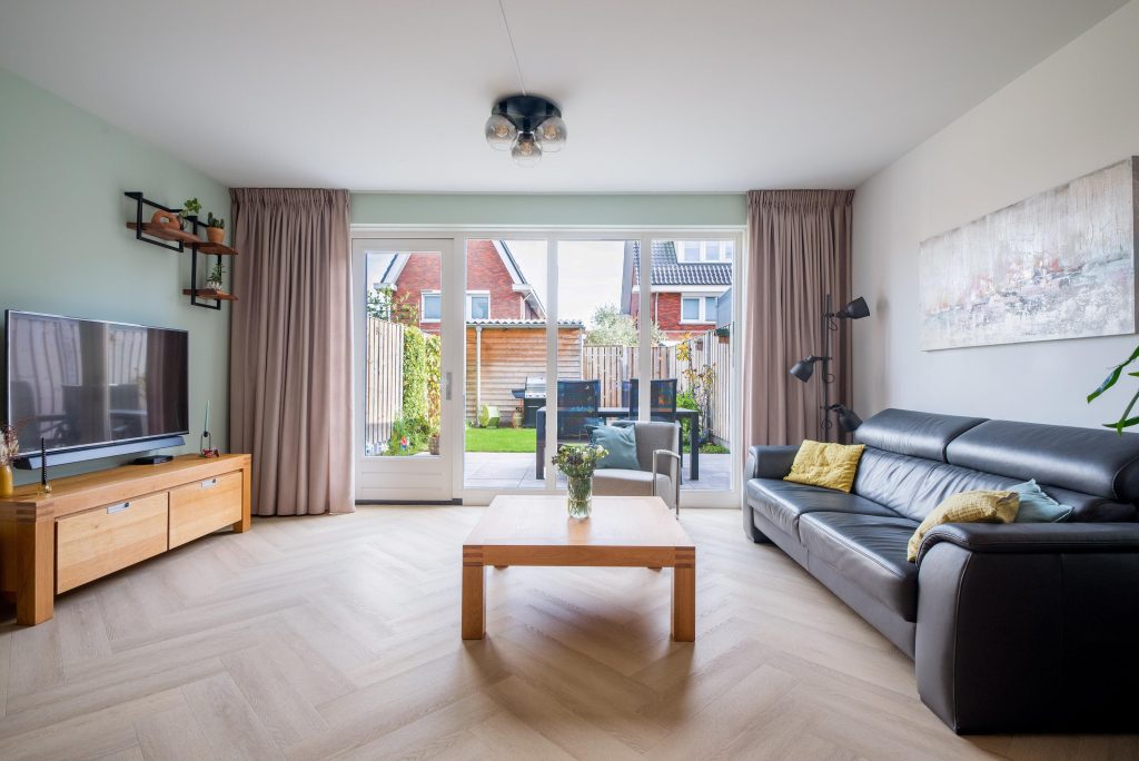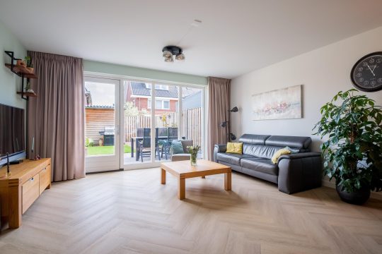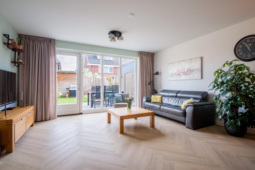 Uitgebouwde woonkamer, met pvc vloer met vloerverwarming, glad stucwerk wanden en plafond. De tuinkamer geeft middels een deur toegang tot de achtertuin.