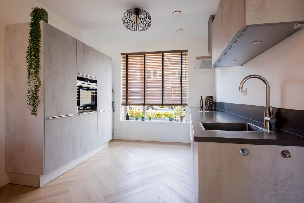 Open keuken, gelegen aan de voorzijde, met pvc vloer met vloerverwarming en voorzien van een lichtgrijze kunststof keukeninrichting met composiet aanrechtblad en een rvs spoelbak. De keuken is geplaatst in een rechte opstelling en een wandopstelling waarin diverse apparatuur is opgenomen zoals de koelkast met vriescombinatie en een combi-oven/magnetron. De keuken is verder voorzien van een 4 pits inductiekookplaat, een rvs schouwafzuigkap en een vaatwasser.