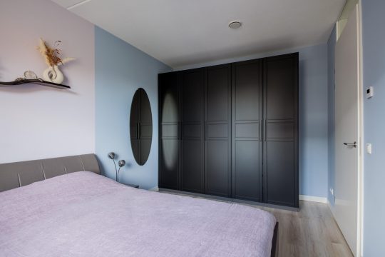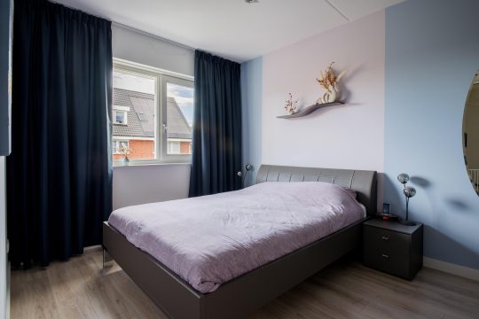 Slaapkamer 1, gelegen aan de achterzijde, met laminaatvloer, glad stucwerk wanden en spuitwerk plafond.
