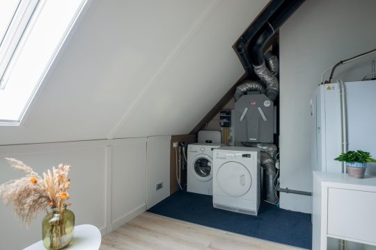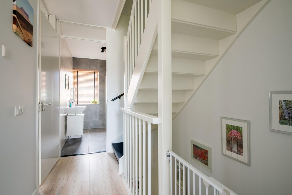 Overloop, bereikbaar middels een dichte trap welke in 2023 vernieuwd is middels traprenovatie met laminaatvloer, glad stucwerk wanden en witte dakplaten plafond. Hier bevinden zich de aansluitingen voor de wasapparatuur, de unit voor de warmtepomp, de unit voor de WTW Warmte Terug Win installatie en de verdeler voor de zonnepanelen.