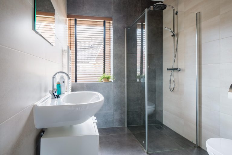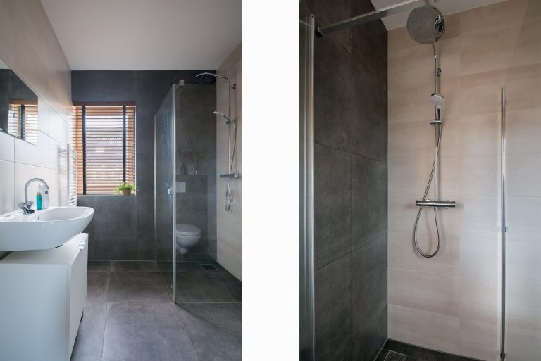 Badkamer, geheel betegeld en voorzien van een douchehoek met cabine en met een regen- en handdouche en thermostaatkraan, een wastafel, designradiator en een wandcloset.