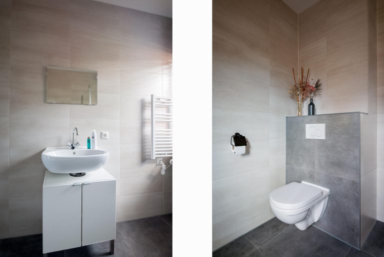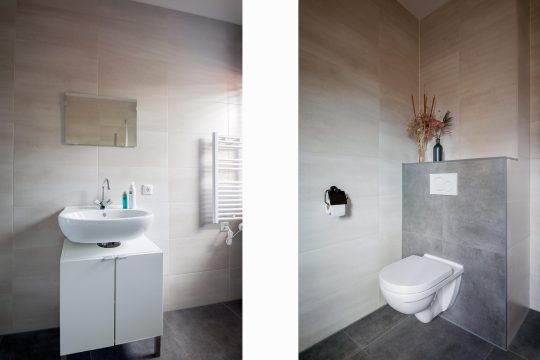 Toilet, met tegelvloer met vloerverwarming, voorzien van een wandcloset en een fonteintje.