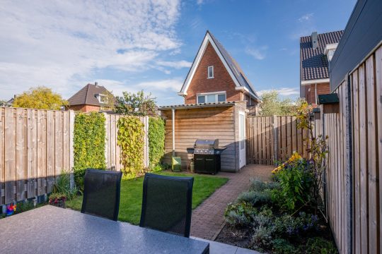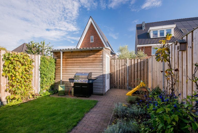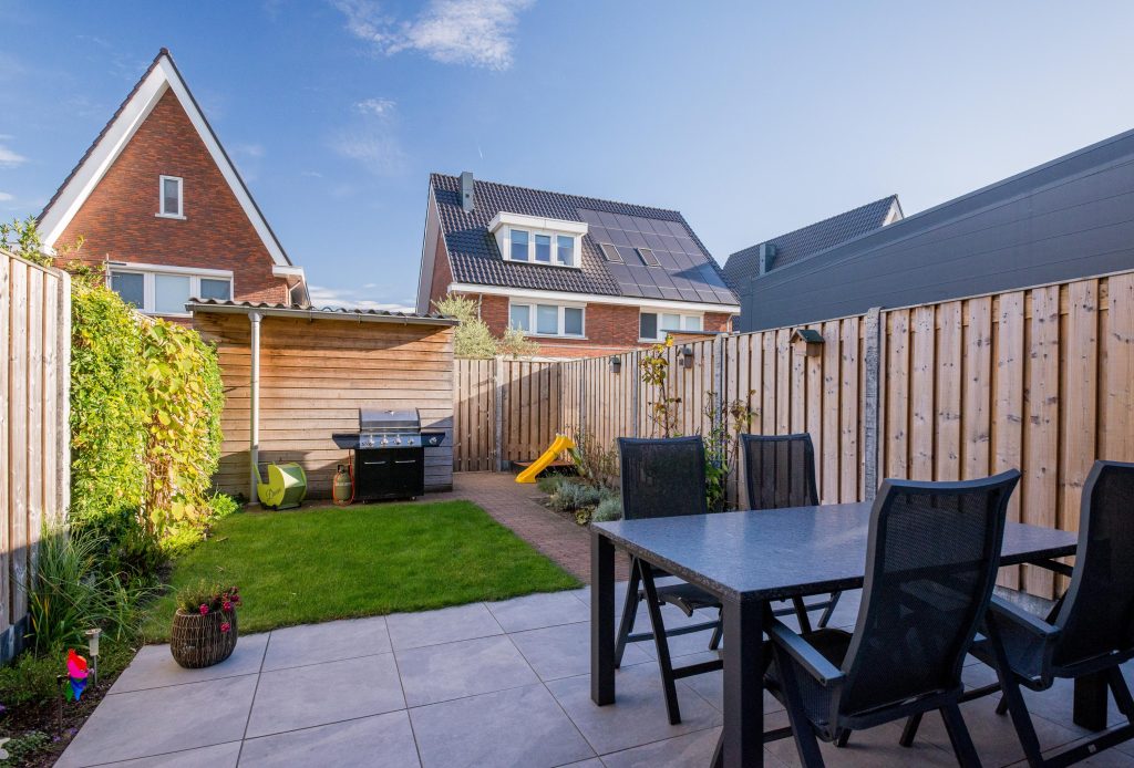 Aangelegde achtertuin, met terras bestraat met betontegels met een keramische toplaag, een elektrisch zonneluifel met ingebouwde verlichting (kan worden overgenomen), gazon en plantenborders, een buitenkraantje en afvoerputje, tuinverlichting, houten schuttingen en houten poort naar achterom. Achter in de tuin staat een houten berging, met betonvloer, houten wanden en golfplaten plafond, voorzien van elektra.