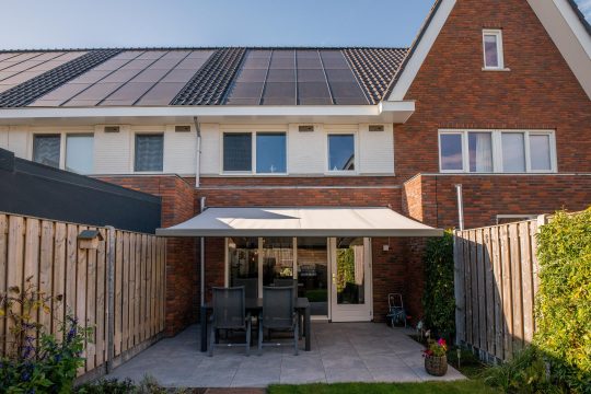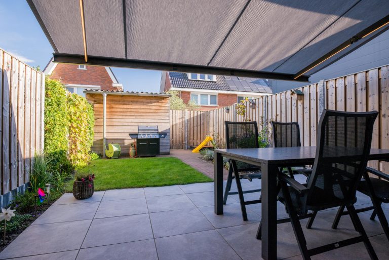 Landscaped backyard, with a terrace paved with concrete tiles with a ceramic top layer, an electric sun awning with built-in lighting (can be taken over), lawn and plant borders, an outdoor tap and drain, garden lighting, wooden fences and a wooden gate to the back. At the back of the garden is a wooden storage shed, with concrete floor, wooden walls, and corrugated iron ceiling, equipped with electricity.
