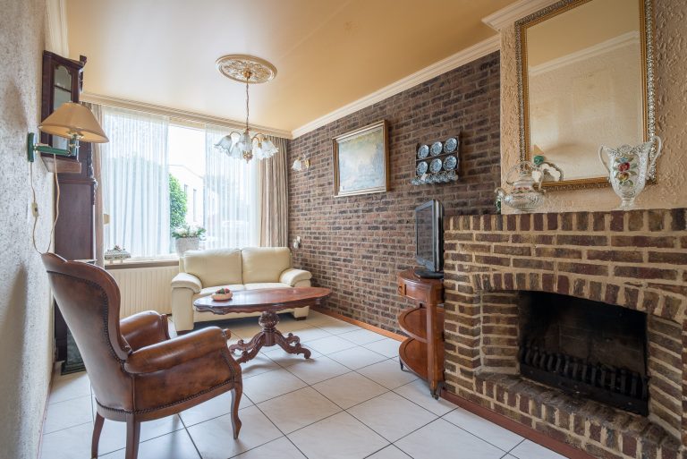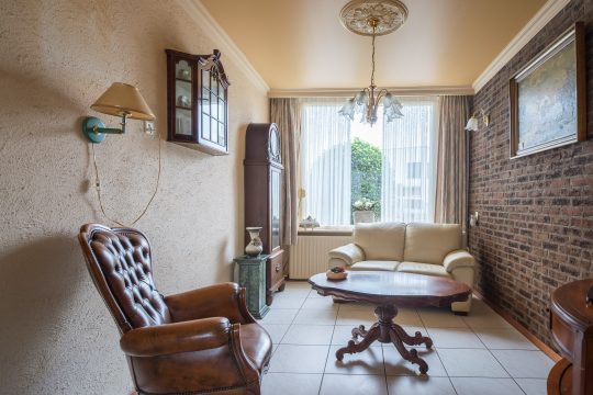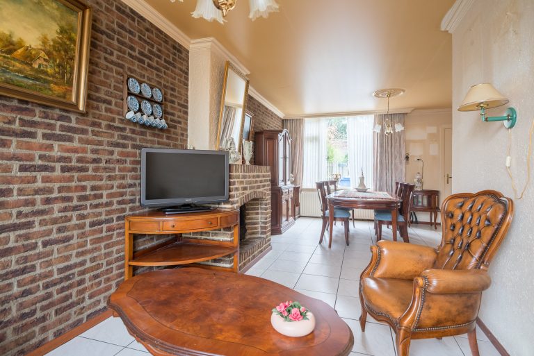 De L- vormige woonkamer, met tegelvloer, met stucwerk en schoonmetselwerk wanden en met spanplafond. De woonkamer is voorzien van een open haard met schouw en een praktische trapkast. Middels een deur toegang tot de keuken die is gelegen aan de achterzijde.