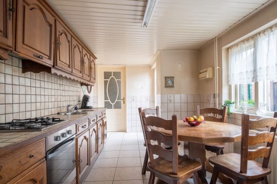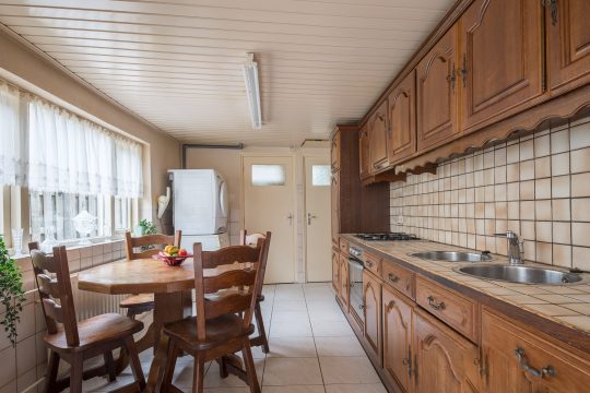Dichte keuken, met tegelvloer en kunststof schrootjes plafond. De keuken is voorzien van een kunststof keukeninrichting met eikenhouten deurtjes met een betegeld aanrechtblad en dubbele spoelbak. De keuken is geplaatst in een rechte opstelling en voorzien van een koelkast, een 4-pits gaskookplaat, afzuigkap, een elektrische oven en de aansluiting voor de wasapparatuur.