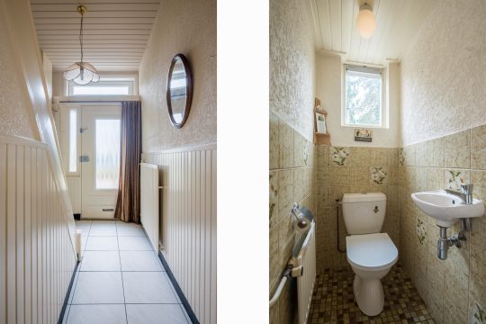 Toilet, deels betegeld en met houten schrootjes plafond, voorzien van een Duobloc toilet en een fonteintje.