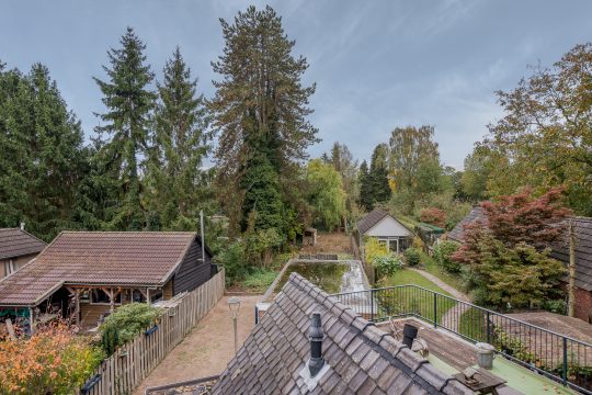 Landscaped back garden, very deep garden with several terraces and a practical storage shed. The garden faces south.