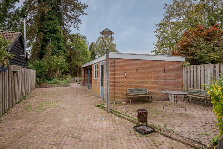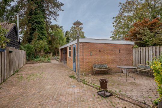 Vrijstaande berging met terrasoverkapping, met betonvloer, gemetselde wanden en houten plafond. Voorzien van elektra.