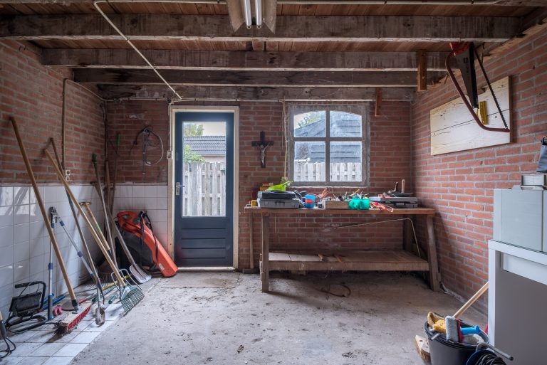 Detached storage shed with terrace roof, concrete floor, brick walls and wooden ceiling. Equipped with electricity.