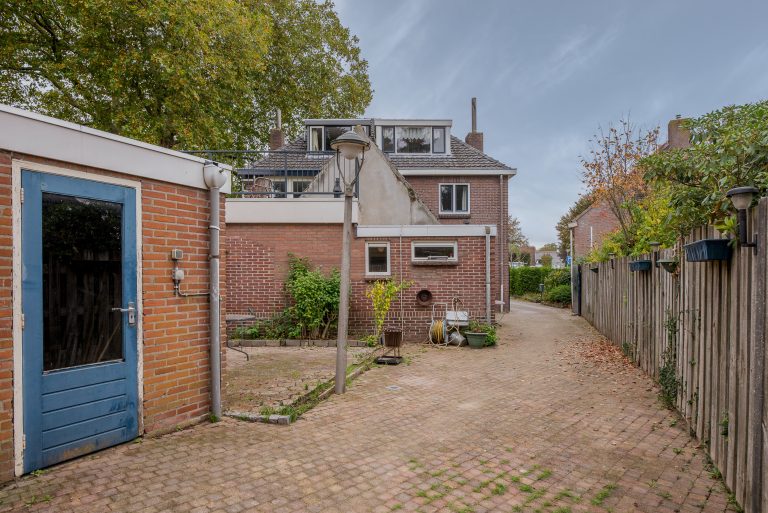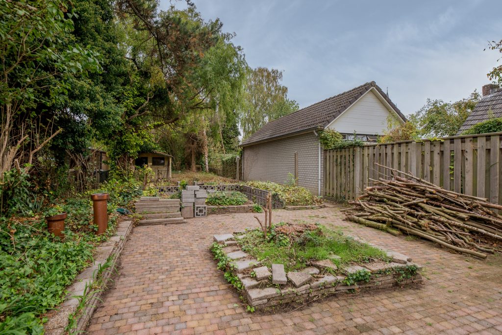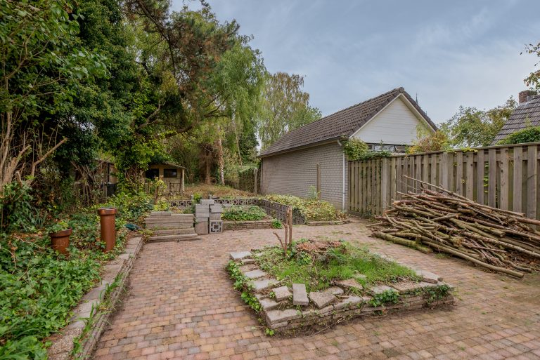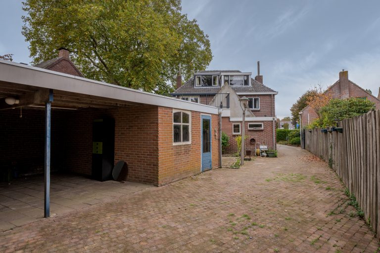 Aangelegde voortuin, met oprit en poort naar de achtertuin.