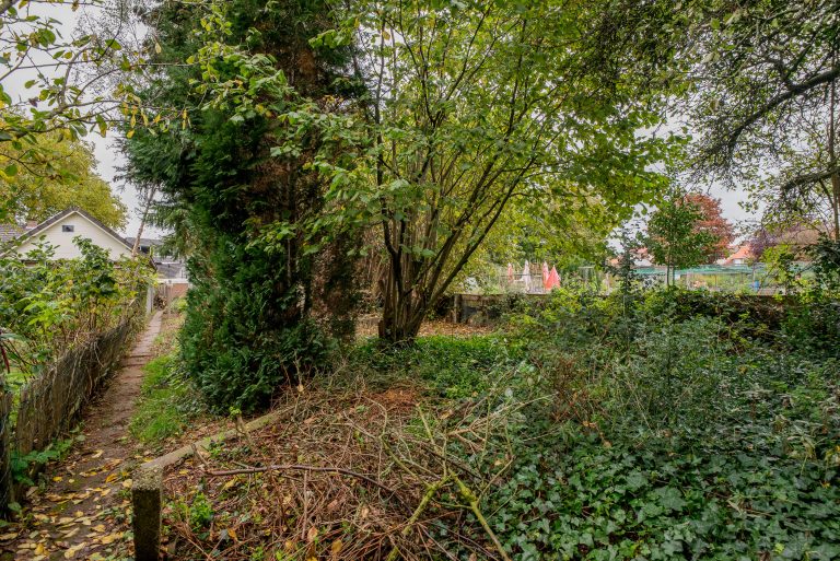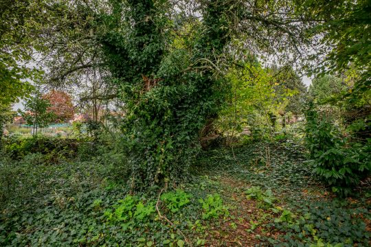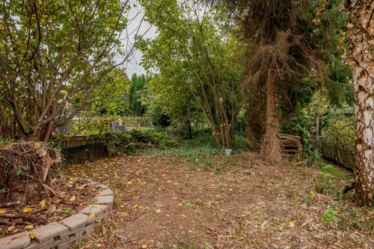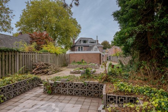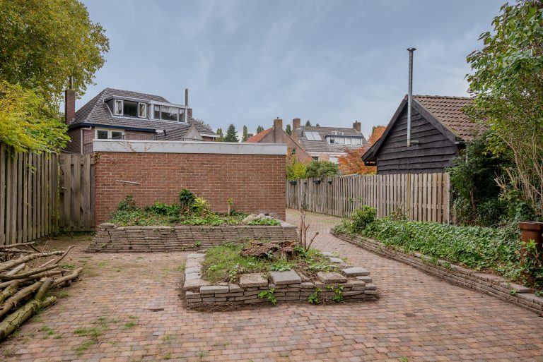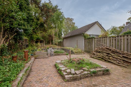 Aangelegde achtertuin, zeer diepe tuin met verschillende terrassen en een praktische berging. De tuin is gelegen op het zuiden.