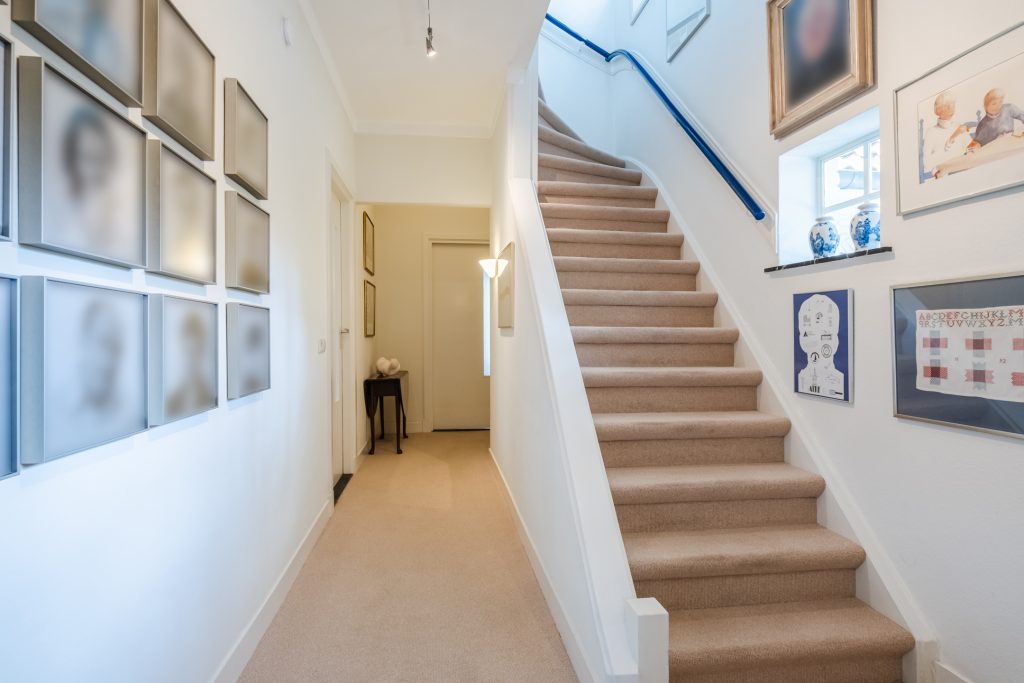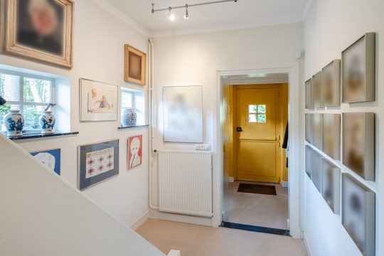 Landing, accessible via a closed staircase, with carpeted floors, wallpapered walls and a sanded ceiling.