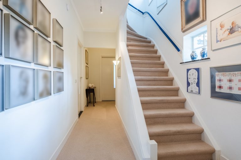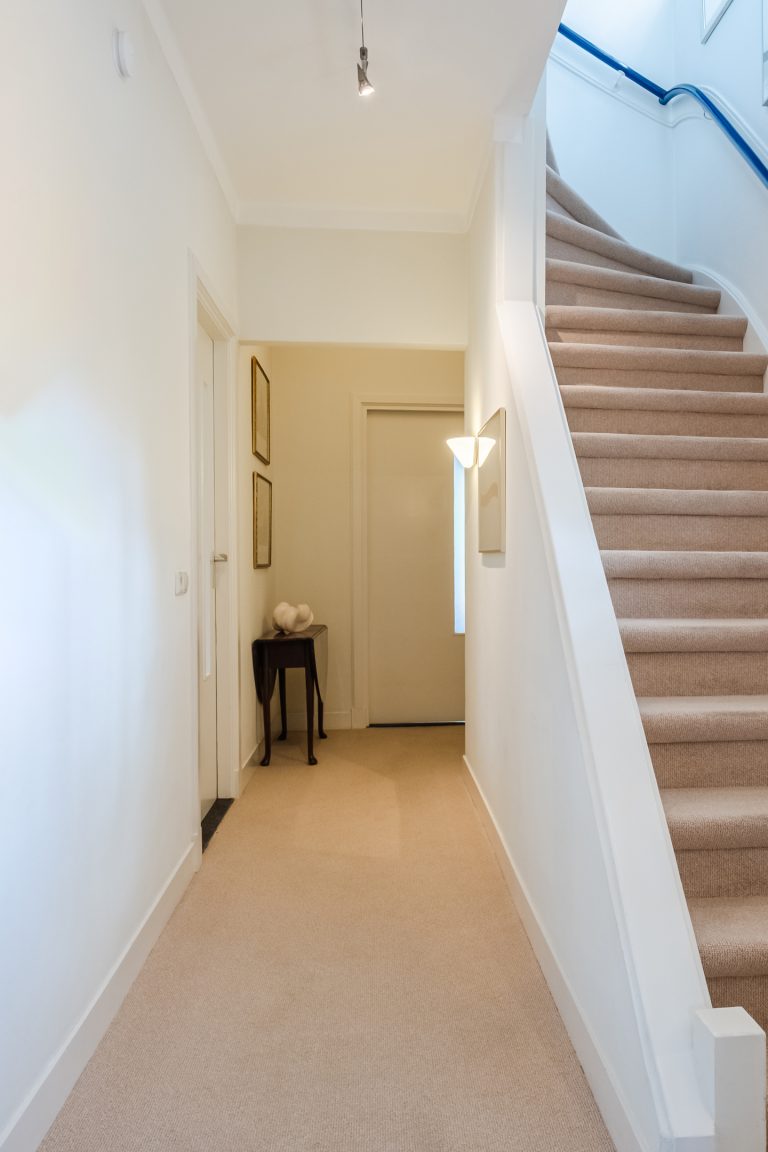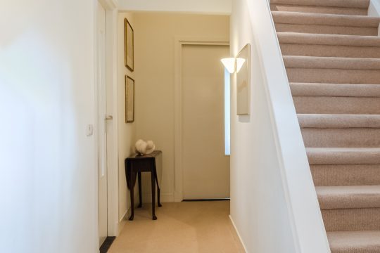 Foyer, featuring carpeted floors and sanded walls and ceiling. From the foyer, there is access to the toilet, the full-height basement, the staircase to the first floor, the dining room and the kitchen-diner.