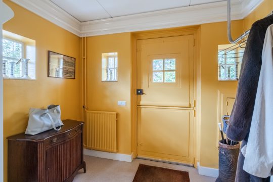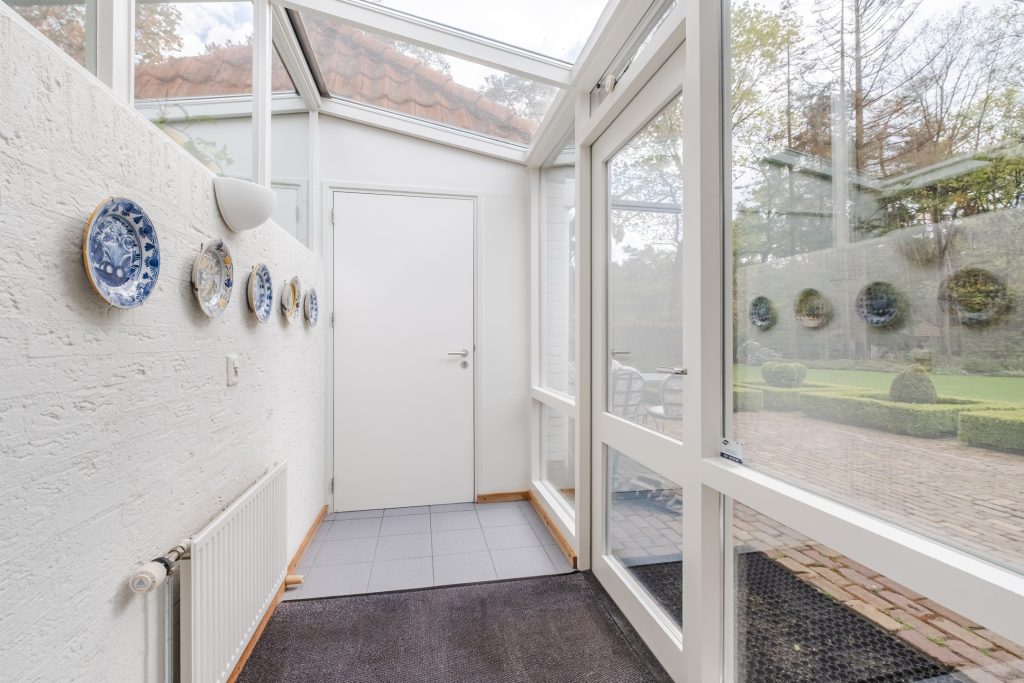 Vanuit de eetkeuken heeft men toegang tot een tussenhal met deur naar de tuin en deur naar de zitkamer. De tussenhal met wit geschilderd schoonmetselwerk wanden en een glazen dak.