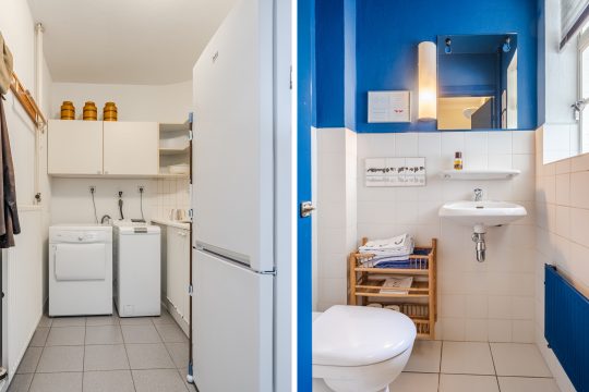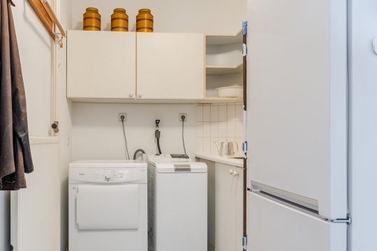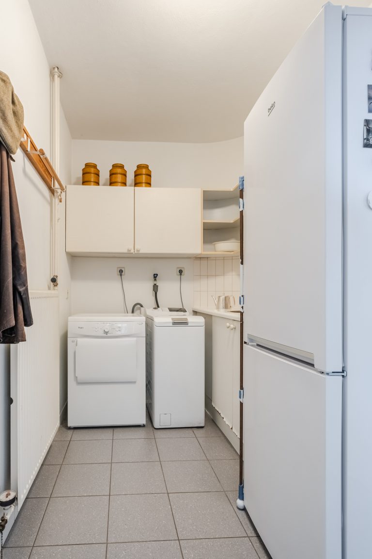Bijkeuken, met tegelvloer, schuurwerk wanden en plafond. Hier bevinden zich de aansluitingen voor de wasapparatuur. Vanuit de bijkeuken heeft men middels een deur toegang tot de oprit. Vanuit de bijkeuken toegang tot de garage/berging.