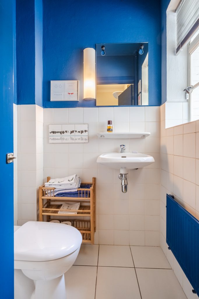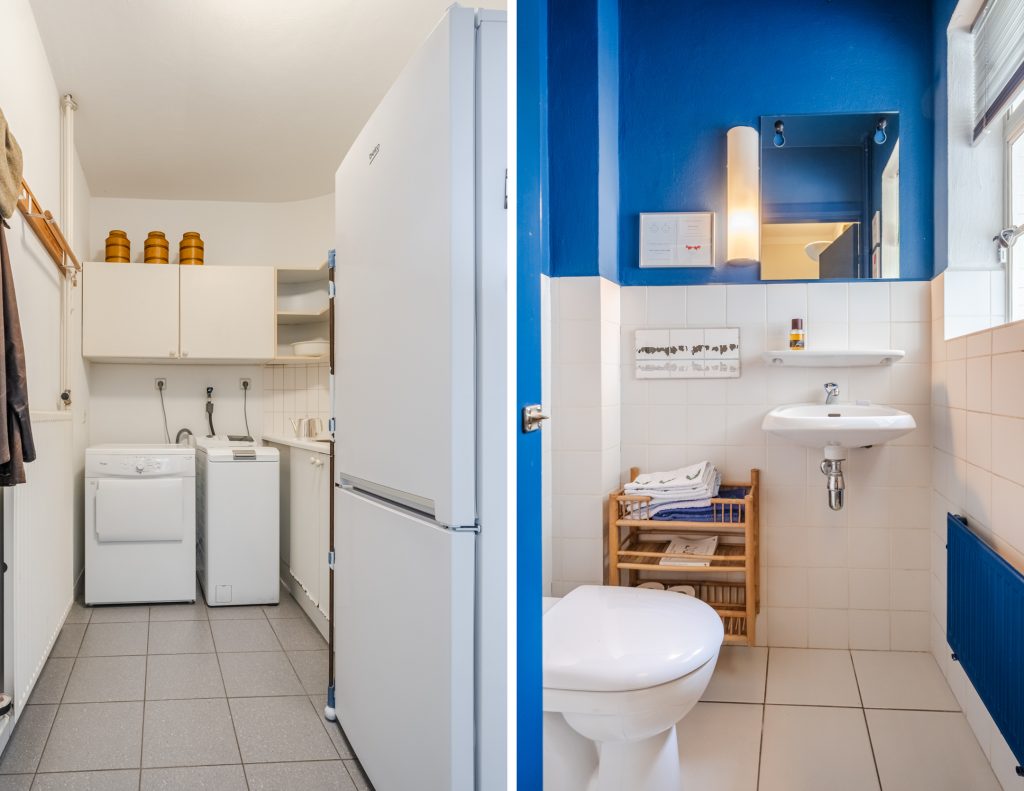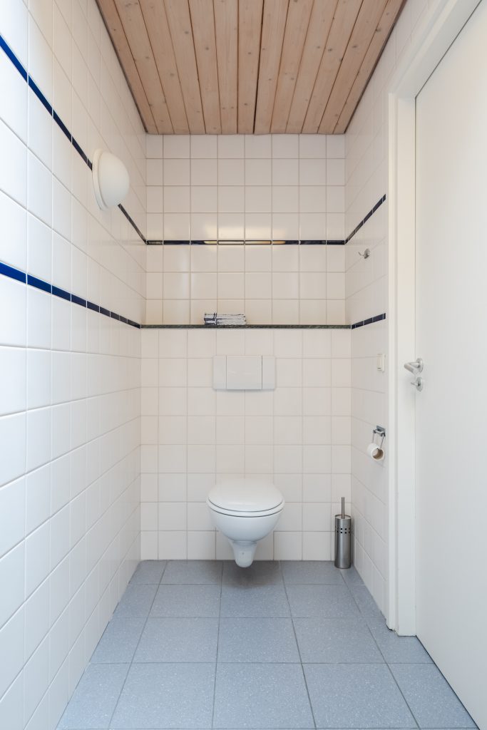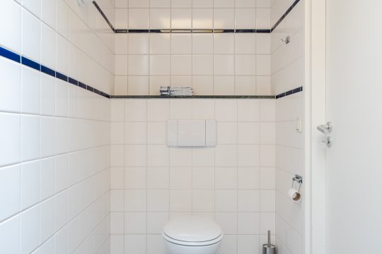 Toilet, deels betegeld en voorzien van een duobloc closet en fonteintje.