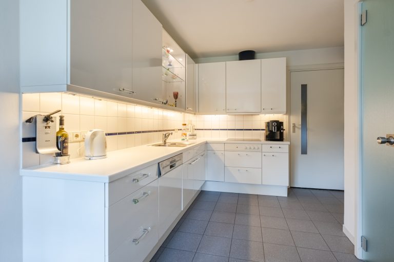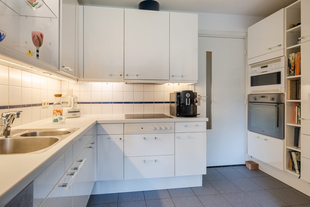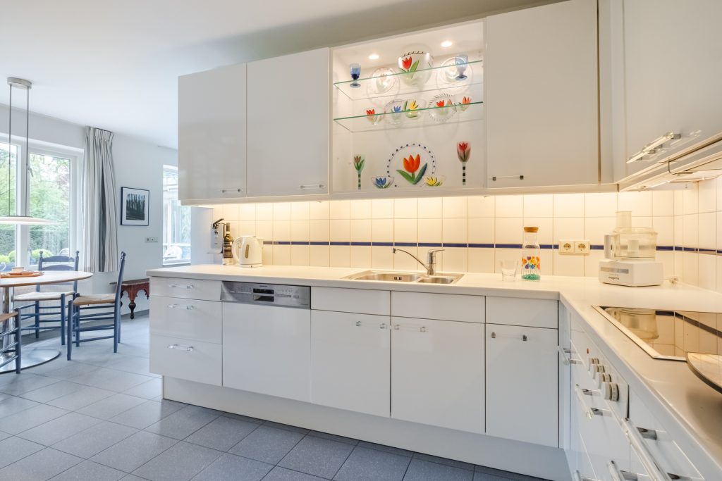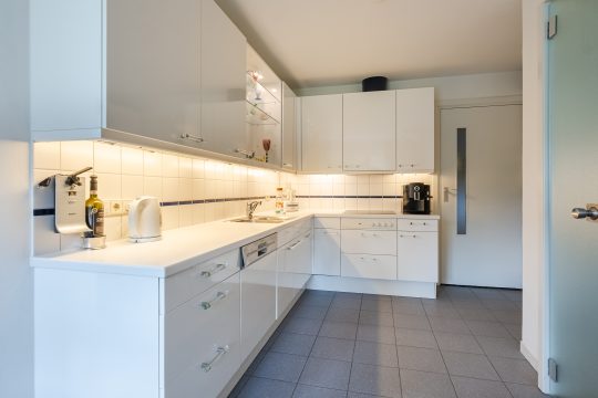 Eetkeuken, met tegelvloer, deels betegelde en schuurwerk wanden en schuurwerk plafond, De keuken is voorzien van een hoogglans witte Poggenpohl keukeninrichting, geplaatst in een hoek- en wandopstelling. In de wandopstelling is opgenomen de koelkast, de hete lucht oven en magnetron. In de hoekopstelling is opgenomen de inductiekookplaat, afzuigkap, de 1½ rvs spoelbak en vaatwasser. Vanuit de eetkeuken heeft men magnifiek uitzicht op de tuin.