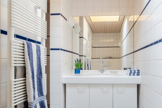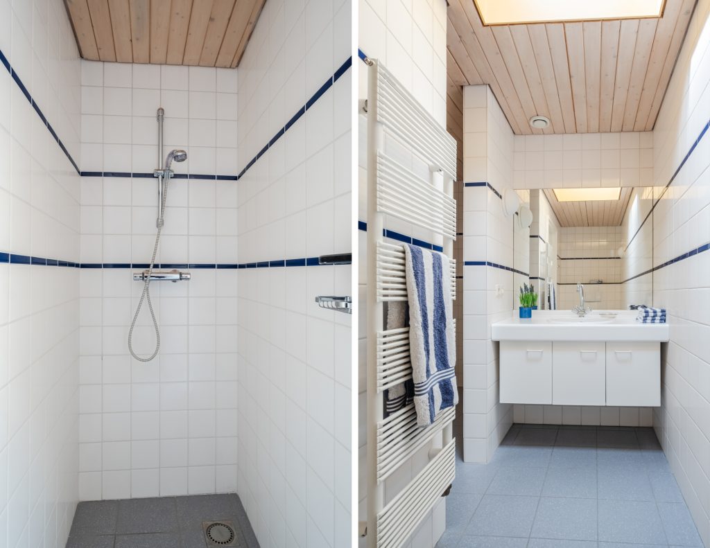 Badkamer, geheel betegeld en voorzien van een wastafel in meubel, een inloopdouche met thermostaatkraan, wandcloset en designradiator.
